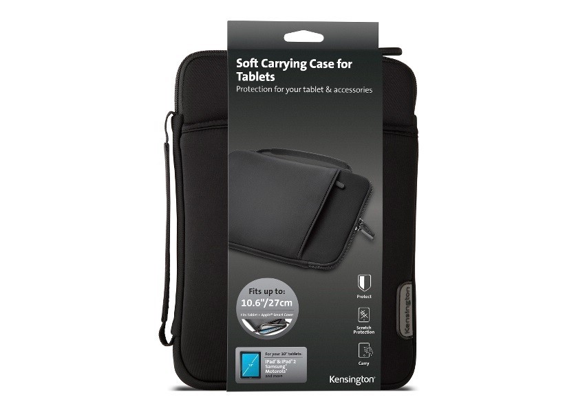 The Kensington Soft Carrying Case offers stylish protection for your 10" tablets. The neoprene sleeve cushions your tablet while the soft fleece lining keeps your tablet safe from scratches. A zippered outer pocket is ideal for carrying accessories such as cables, phones and more. And the deep stitched accent delivers professional style. Plus it makes travel through security checkpoints easy.