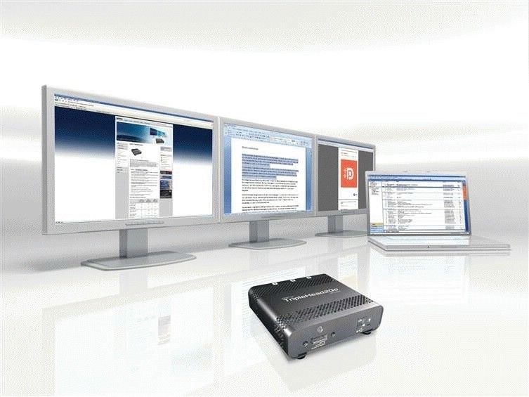 Matrox TripleHead2Go is an external multi-display upgrade that adds up to three monitors to your notebook or desktop computer. Ideal for professionals requiring more desktop space for maximum productivity increases and gamers wanting a totally immersive experience, this small box lets you run different applications on each display or view one application across up to three monitors. Available in DisplayPort, Digital, or Analog Editions.